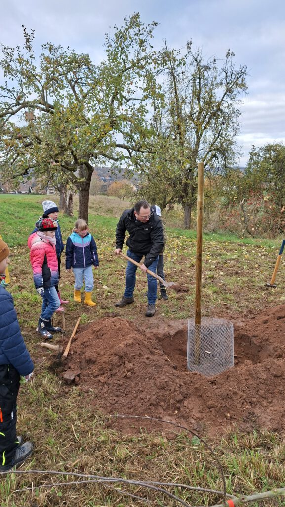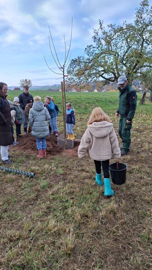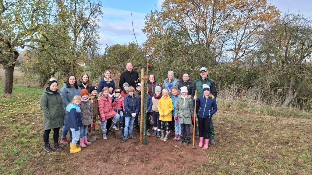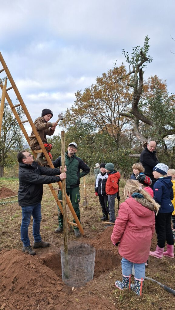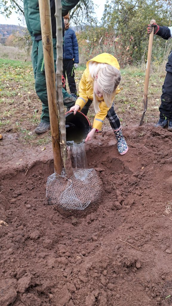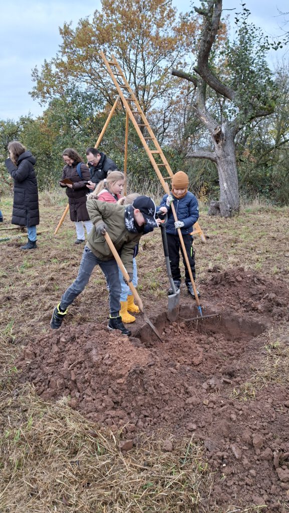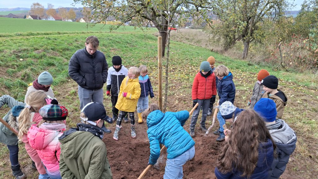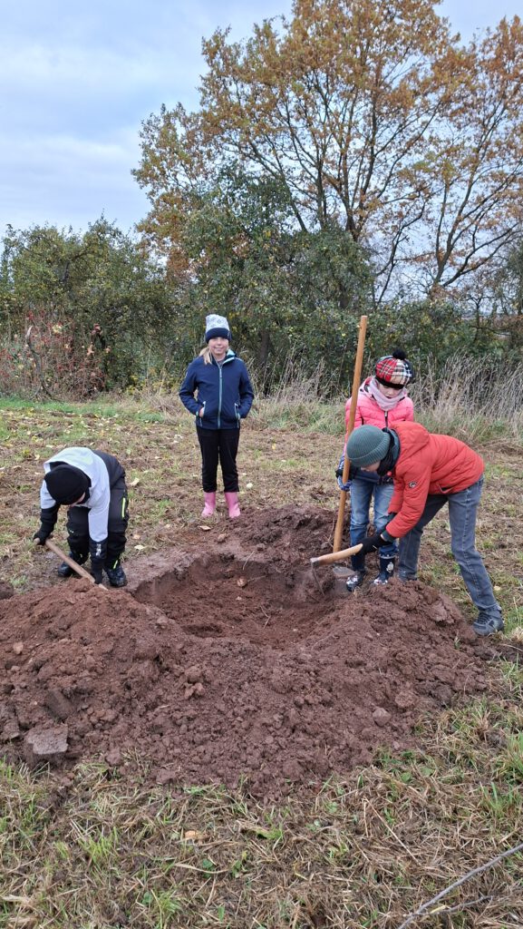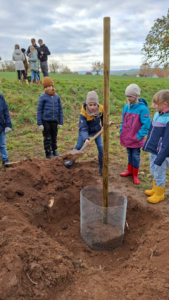 Auch das Bäumepflanzen ist in diesem Konzept enthalten und so zog Klasse 3 und 4 am 11.November erneut zu der Streuobstwiese, um 2 Apfelbäume zu pflanzen. Herr Nörthemann erzählte, wie alt manche Bäume dort bereits sind und wie wichtig ihm die Auswahl der richtigen Sorte ist, um die alten Bestände traditionell weiterleben zu lassen. Begleitet wurde unser Ausflug auch durch unseren Ortsbürgermeister Herrn Wüstefeld, sowie Vertreter der Stadt Duderstadt und der Sponsoren des Projektes „Klima macht Schule“. Nun durften die Kinder buddeln und graben, den Holzpfahl einschlagen und den frisch gepflanzten Baum gießen. Die Kinder hatten viel Freude und wir bedanken uns von Herzen für die großartige Vorbereitung durch Herrn Nörthemann und die Unterstützung durch Herrn Wüstefeld.